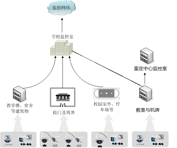 (1)分校區(qū)現(xiàn)有的監(jiān)控點(diǎn)遍布學(xué)校各個(gè)重要點(diǎn)位,包括教學(xué)樓、一體化樓、實(shí)訓(xùn)樓、辦公樓、學(xué)生宿舍、學(xué)生食堂、校內(nèi)重要場(chǎng)所等。通過(guò)光纖鏈路將前端各個(gè)點(diǎn)位匯聚到監(jiān)控中心,并統(tǒng)一傳到監(jiān)控中心集中存儲(chǔ)。